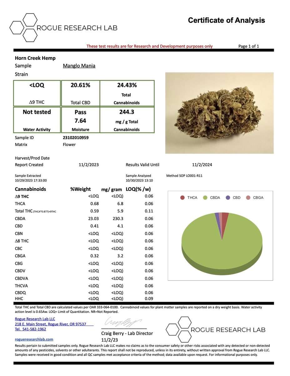 Cannabinoid Content: 24.43% | 20.61% CBD | < LOQ Delta 9