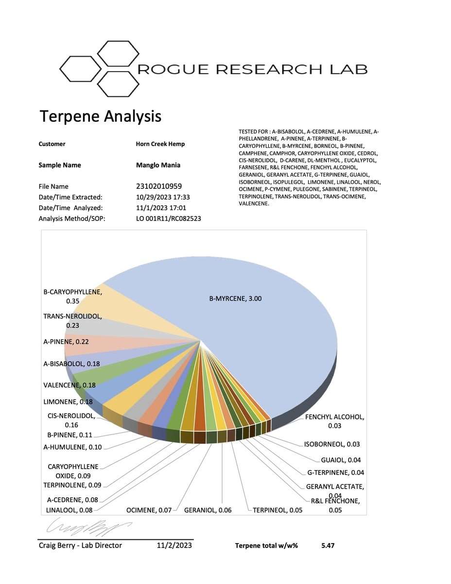 Terpene Profile: 5.47% | Top three in order of dominance: b-Myrcene, b-Caryophyllene, trans-Nerolidol