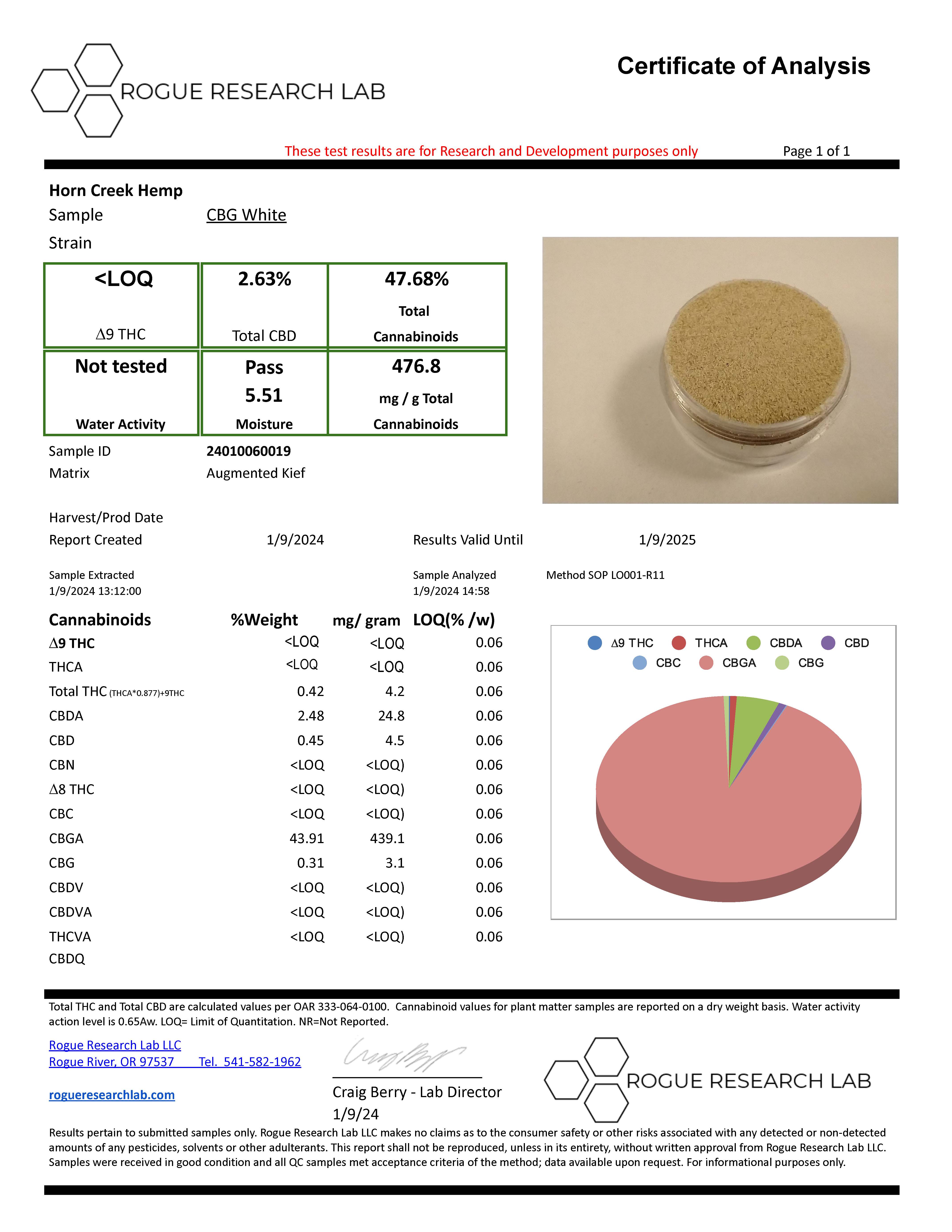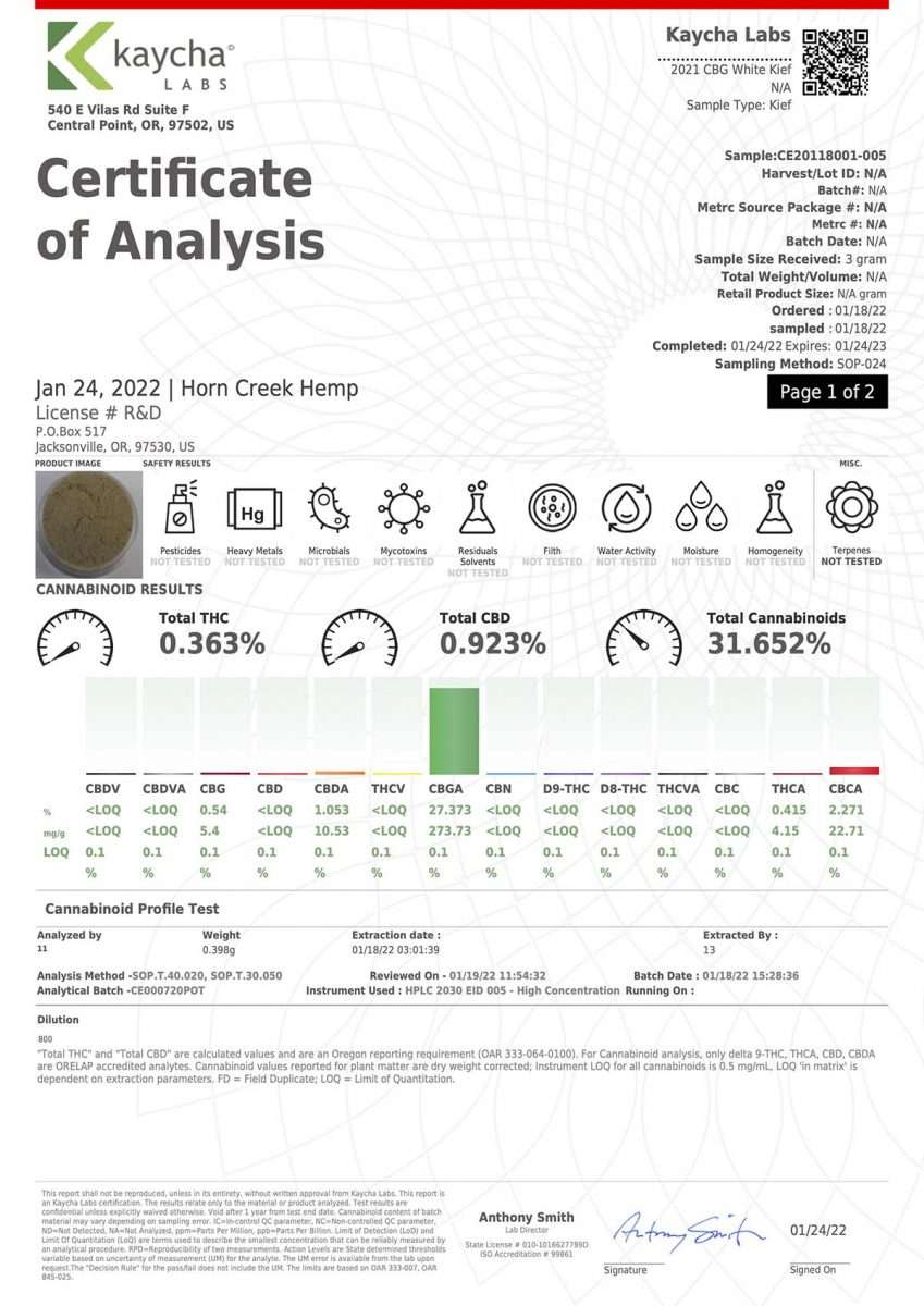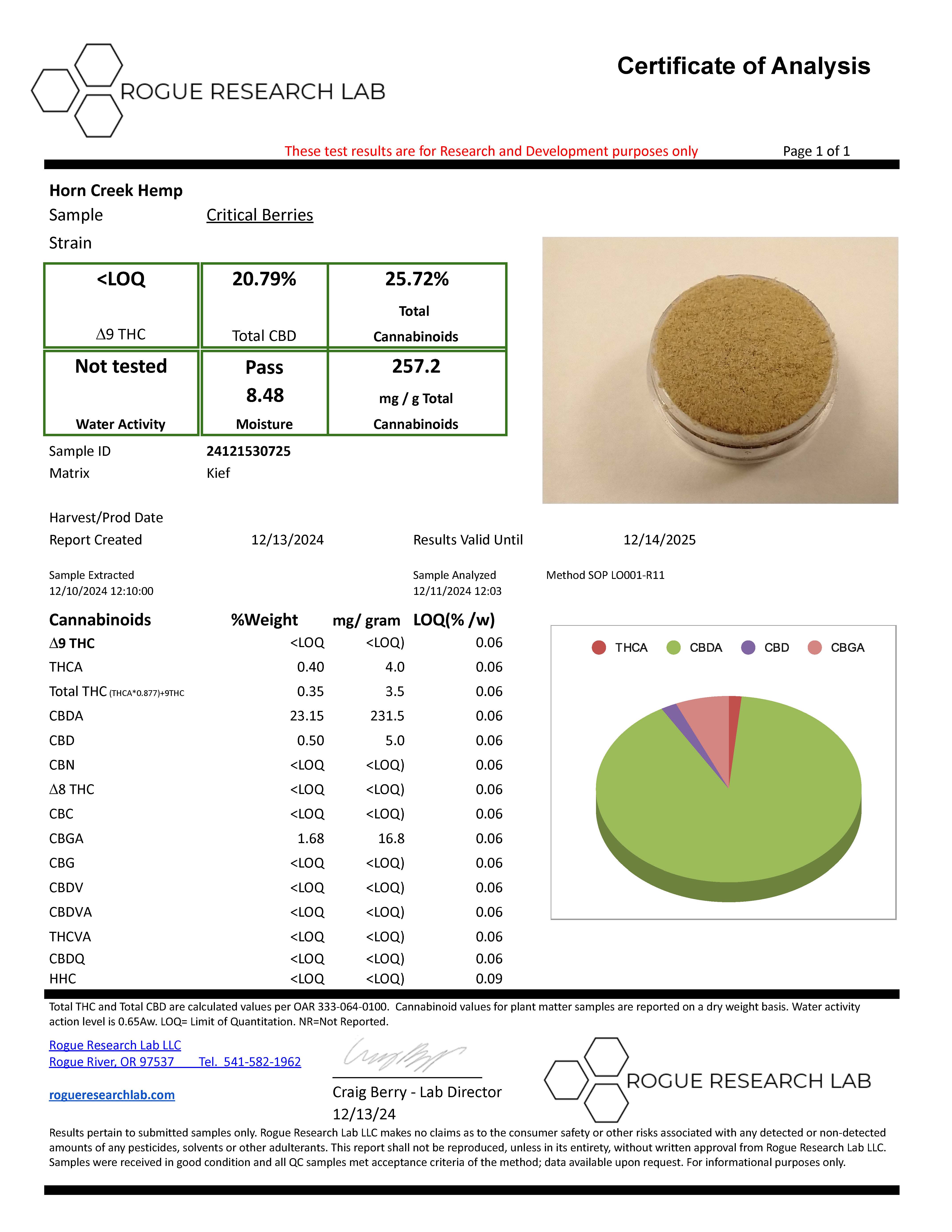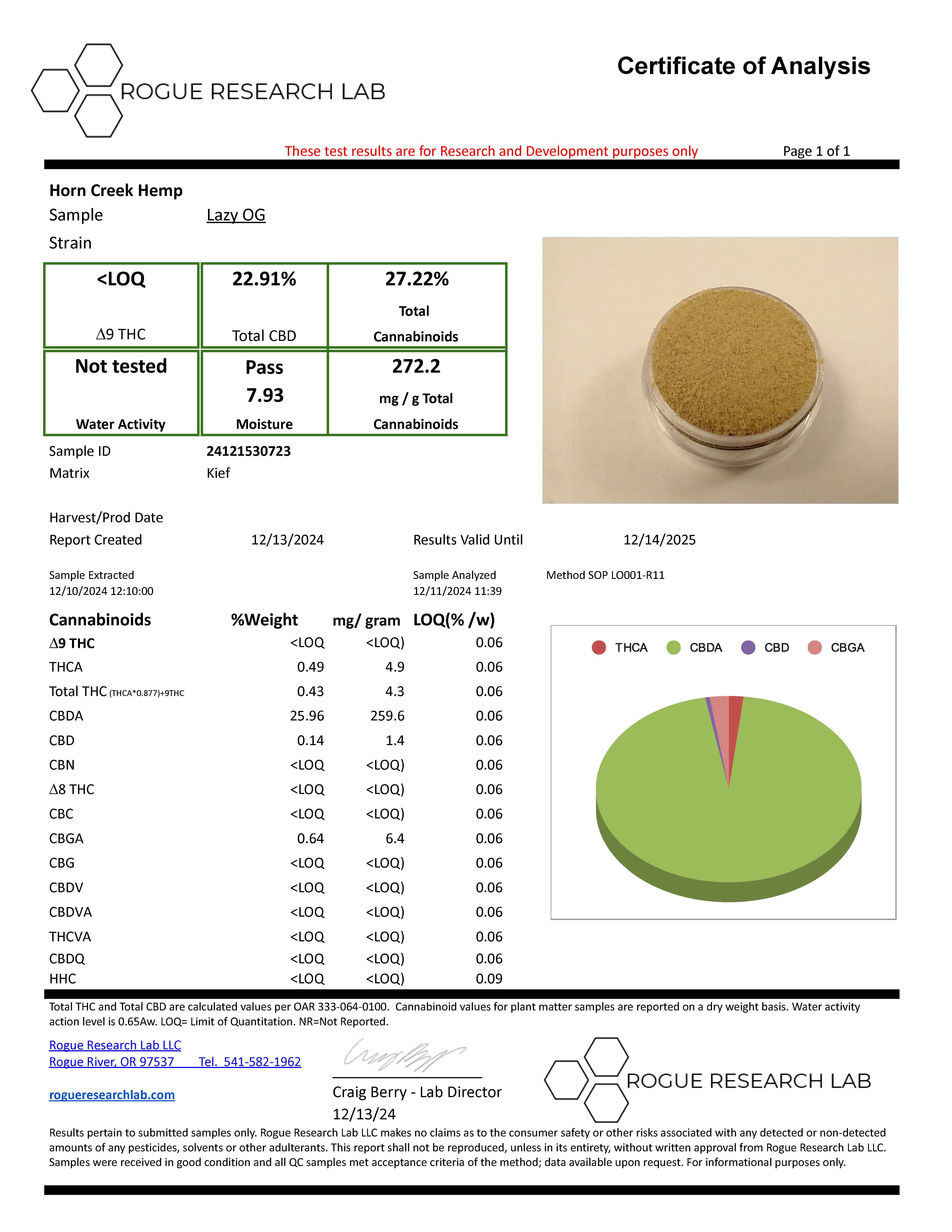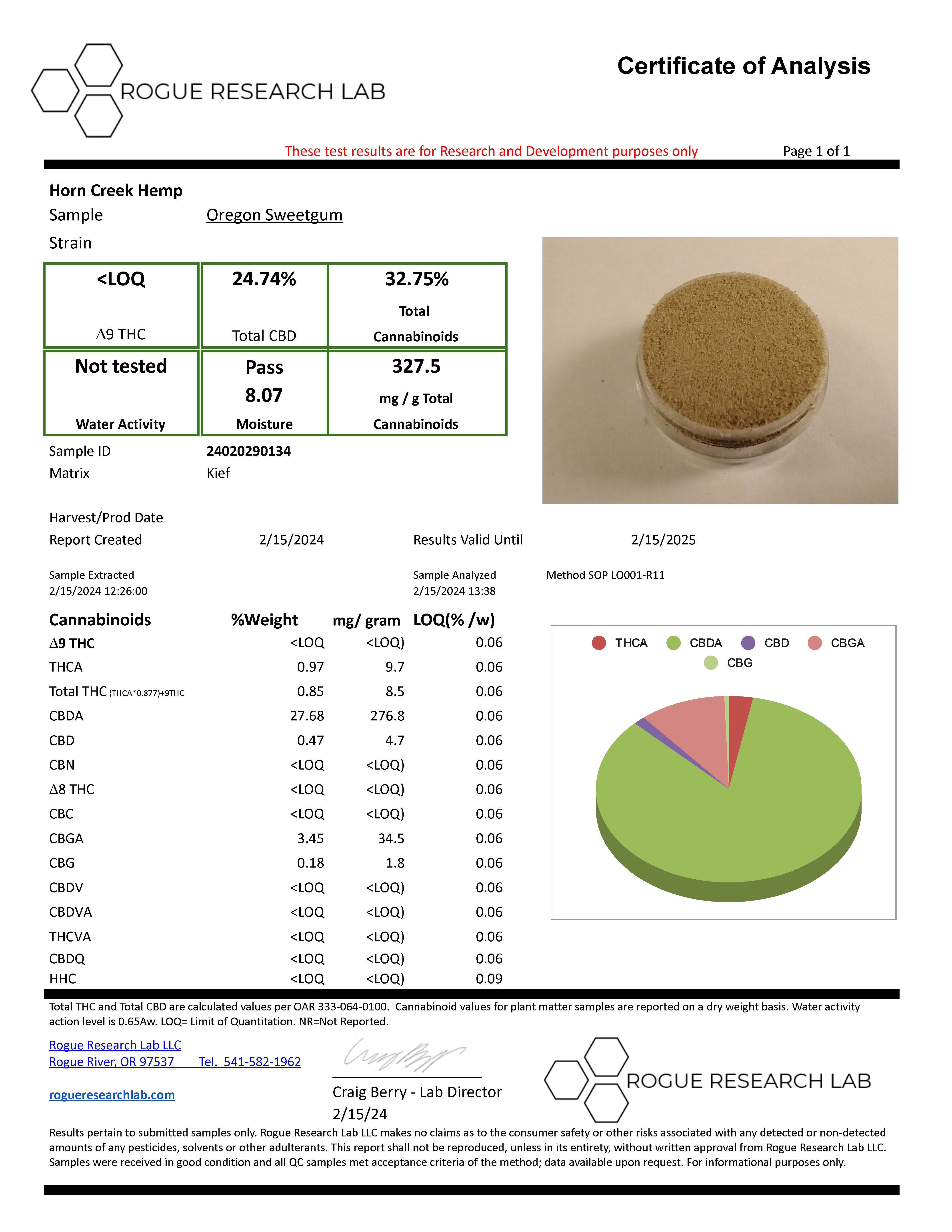 Kief is highly valued for its concentrated potency and versatility. Horn Creek’s Hemp Flower Kief is 100% natural and sourced from our own farm’s biodynamically grown hemp flowers, catering to both enthusiasts and connoisseurs. Our Special Sauce Kief, a gold medal winner in the 2020 Oregon Grower’s Cup and an honoree in the 2021 High Times People’s Choice Hemp Cup, exemplifies quality and excellence. With genetics originating from Oregon CBD, East Fork Cultivars, Hoku Seeds, and Infinite Tree, our kief is a top-tier product of sungrown, solvent-less CBD pollen. Its golden-brown color and cleaner, lighter flavor profile make it an excellent choice for enhancing experiences or creating refined edibles.