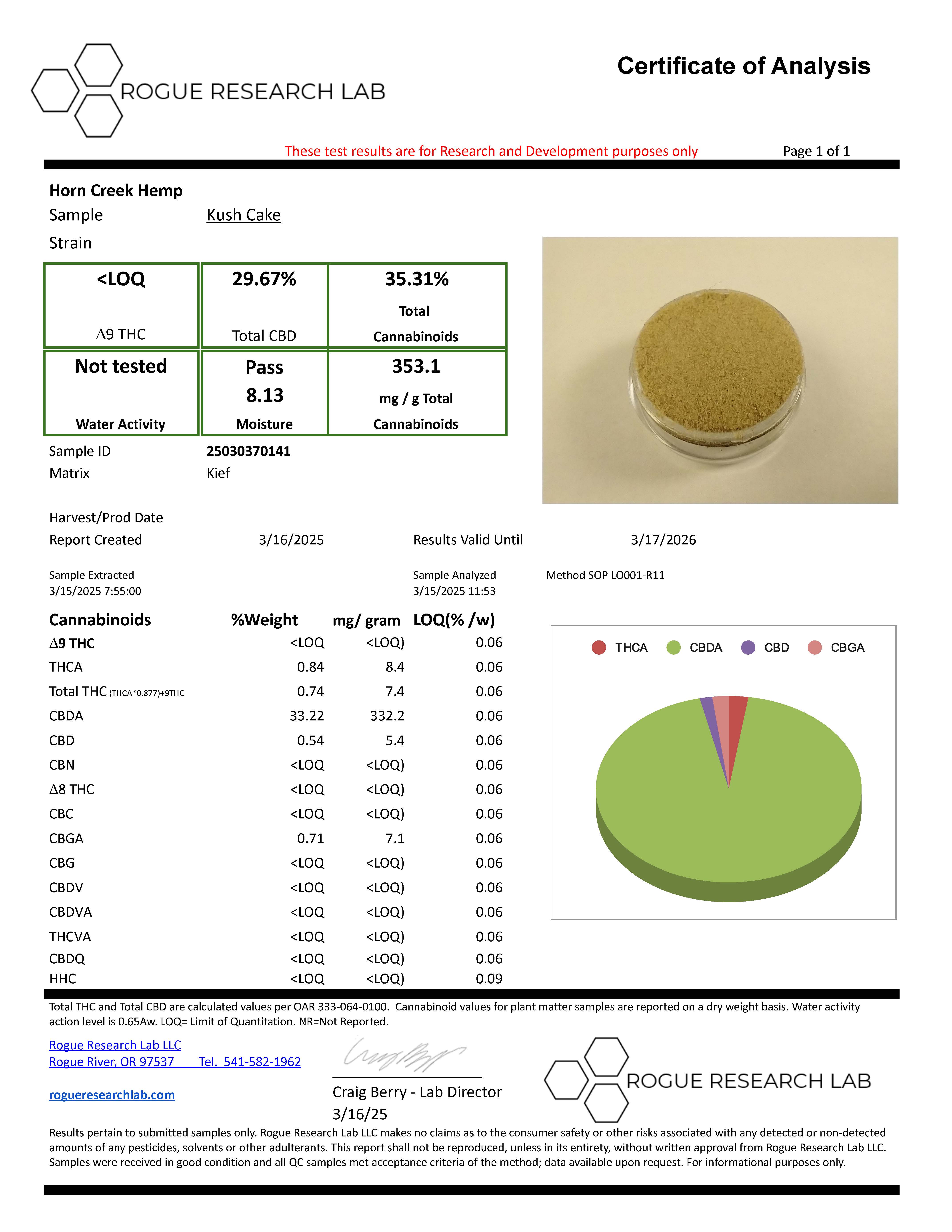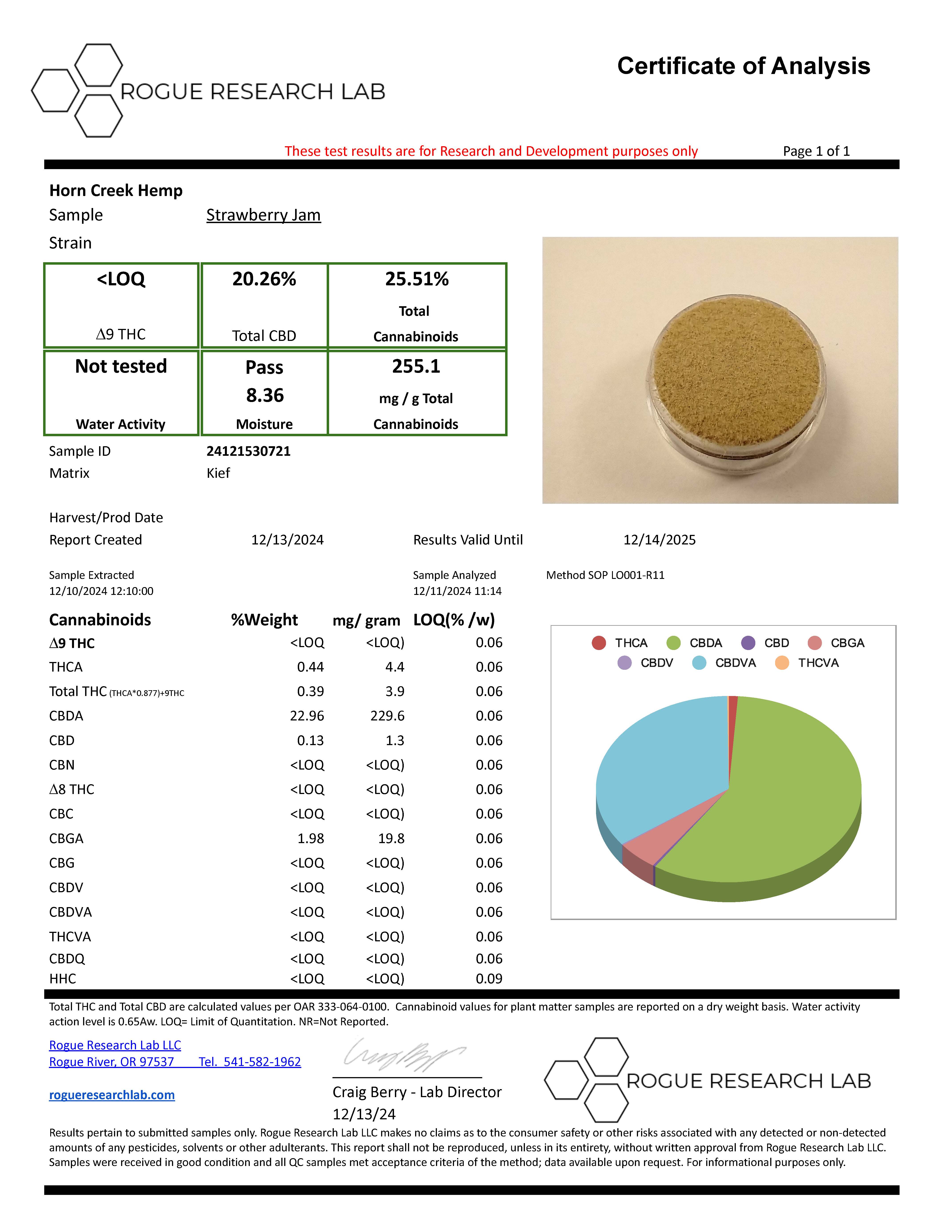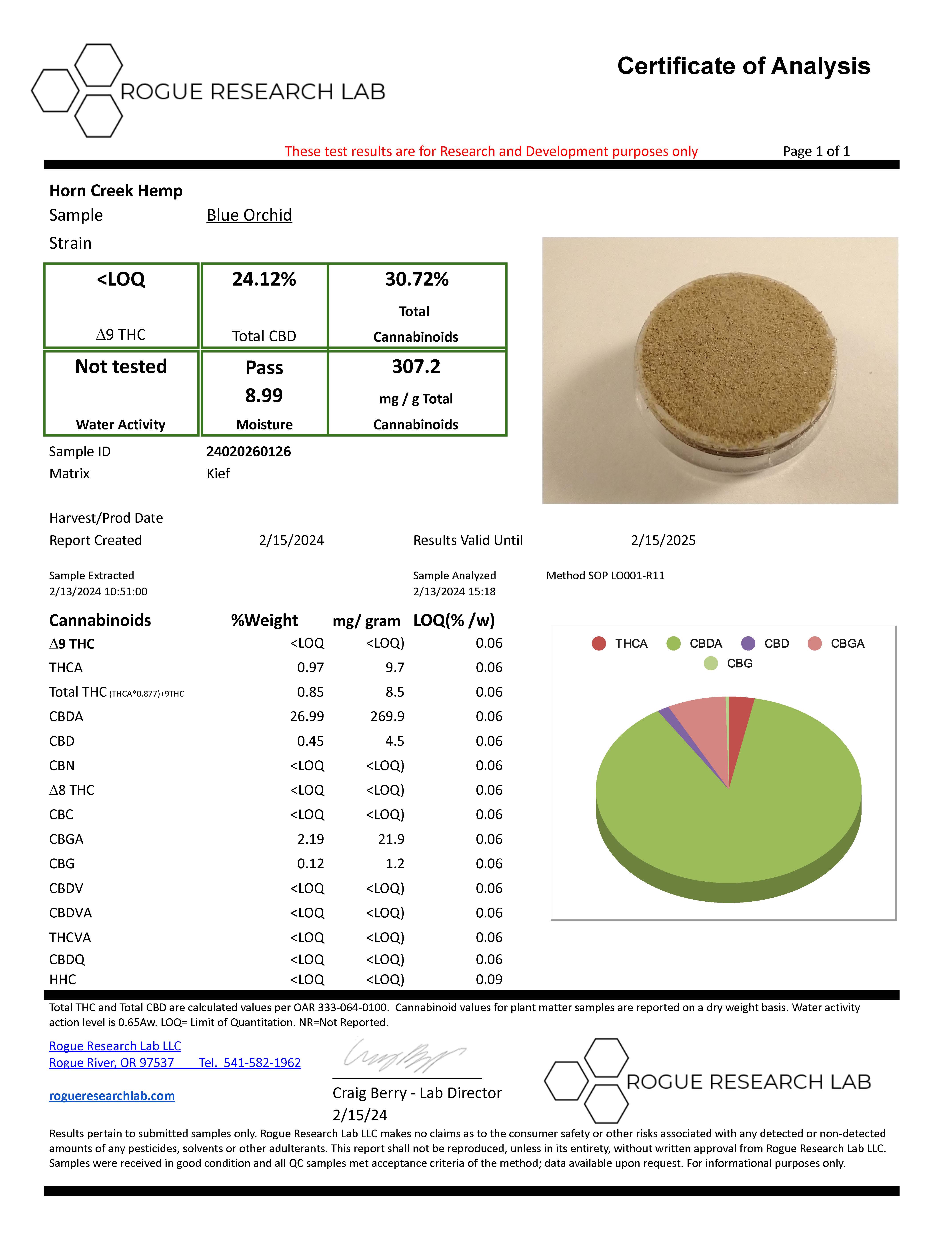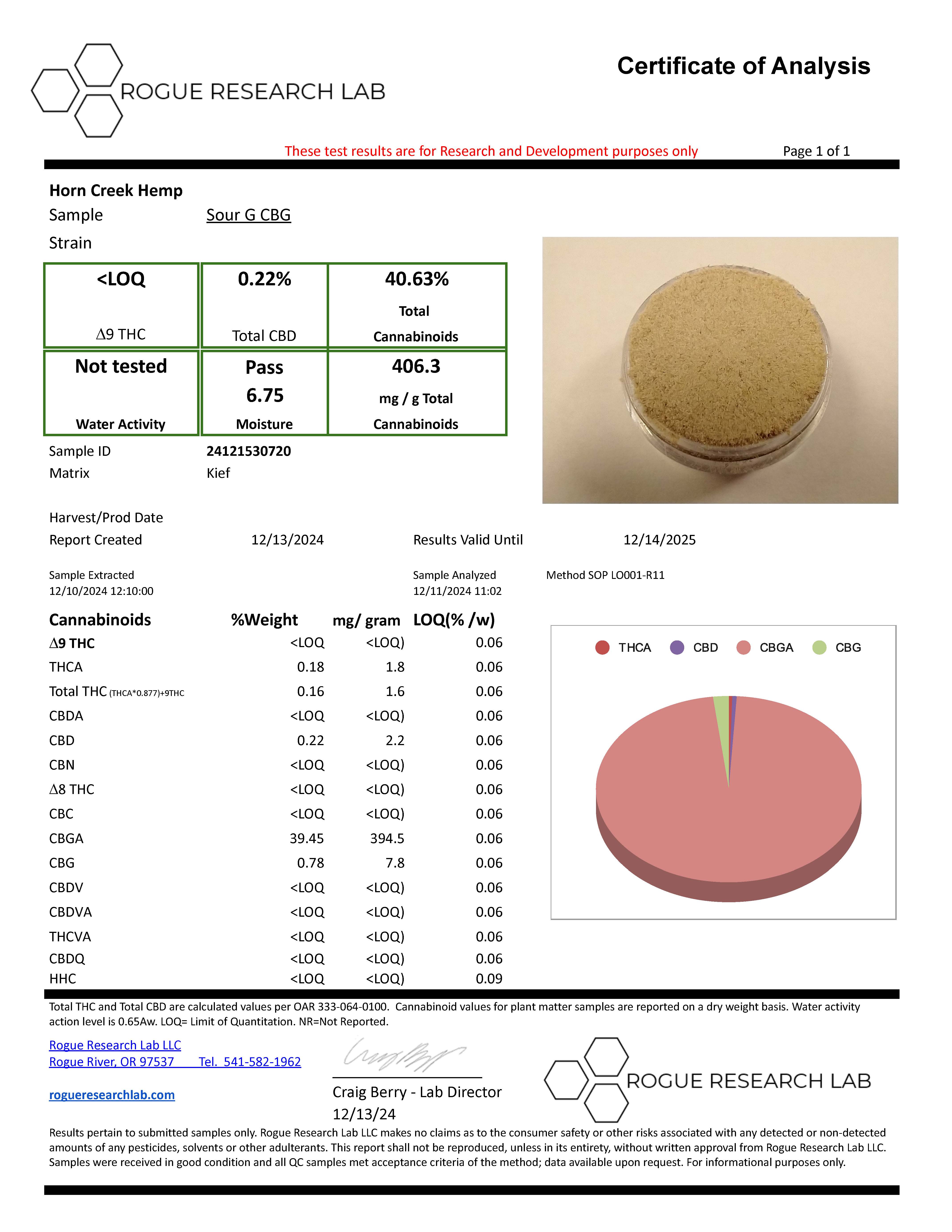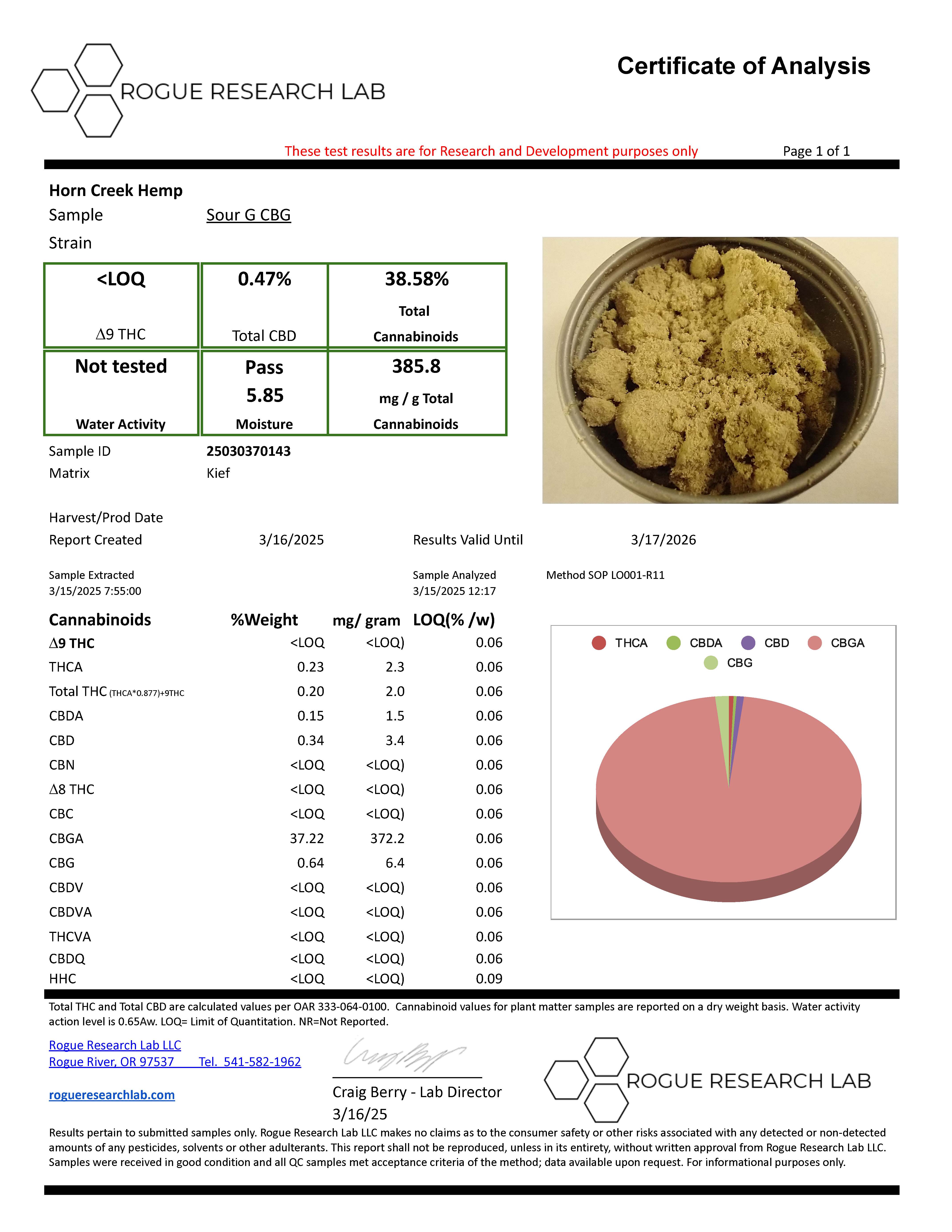 Kief is highly valued for its concentrated potency and versatility. Horn Creek’s Hemp Flower Kief is 100% natural and sourced from our own farm’s biodynamically grown hemp flowers, catering to both enthusiasts and connoisseurs. Our Special Sauce Kief, a gold medal winner in the 2020 Oregon Grower’s Cup and an honoree in the 2021 High Times People’s Choice Hemp Cup, exemplifies quality and excellence. With genetics originating from Oregon CBD, East Fork Cultivars, Hoku Seeds, and Infinite Tree, our kief is a top-tier product of sungrown, solvent-less CBD pollen. Its golden-brown color and cleaner, lighter flavor profile make it an excellent choice for enhancing experiences or creating refined edibles.