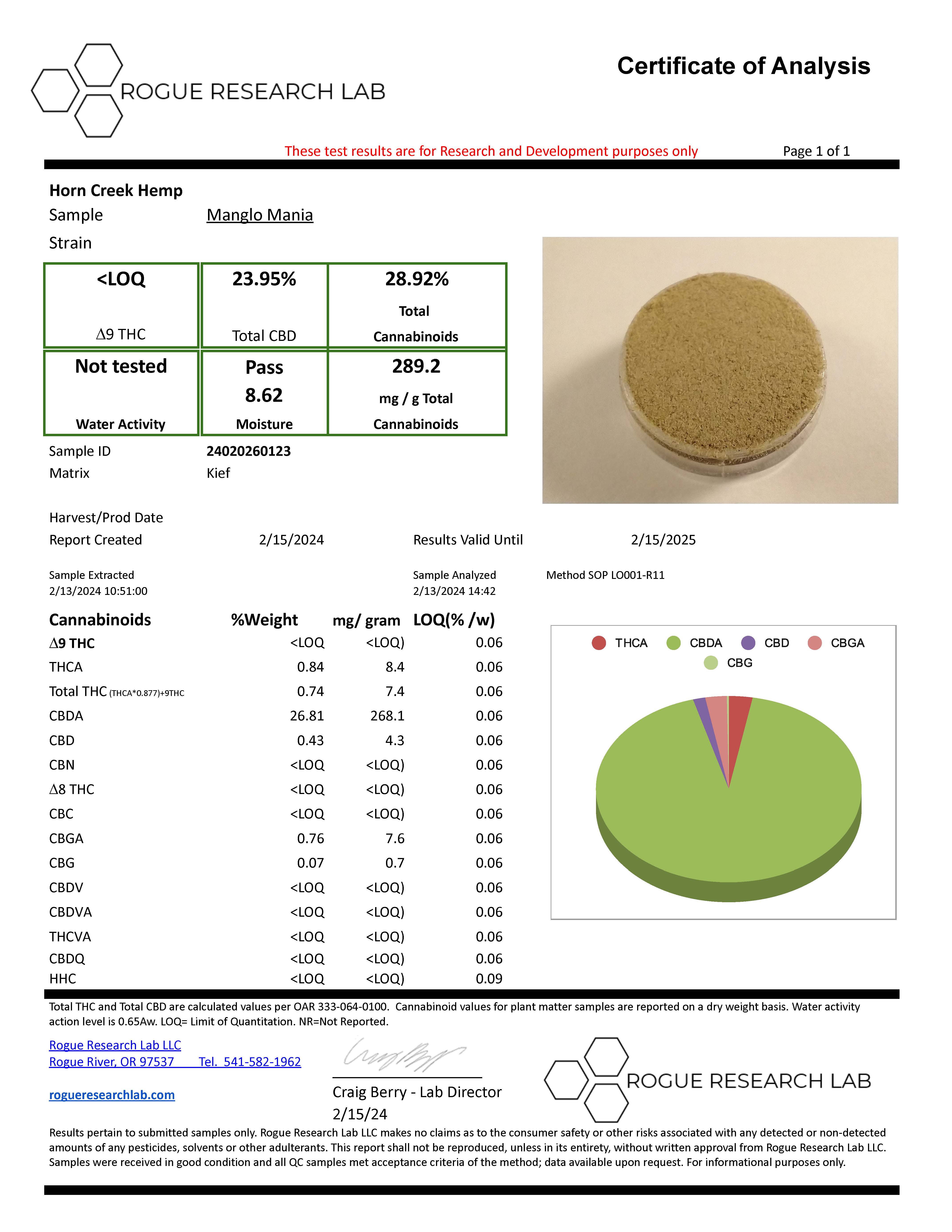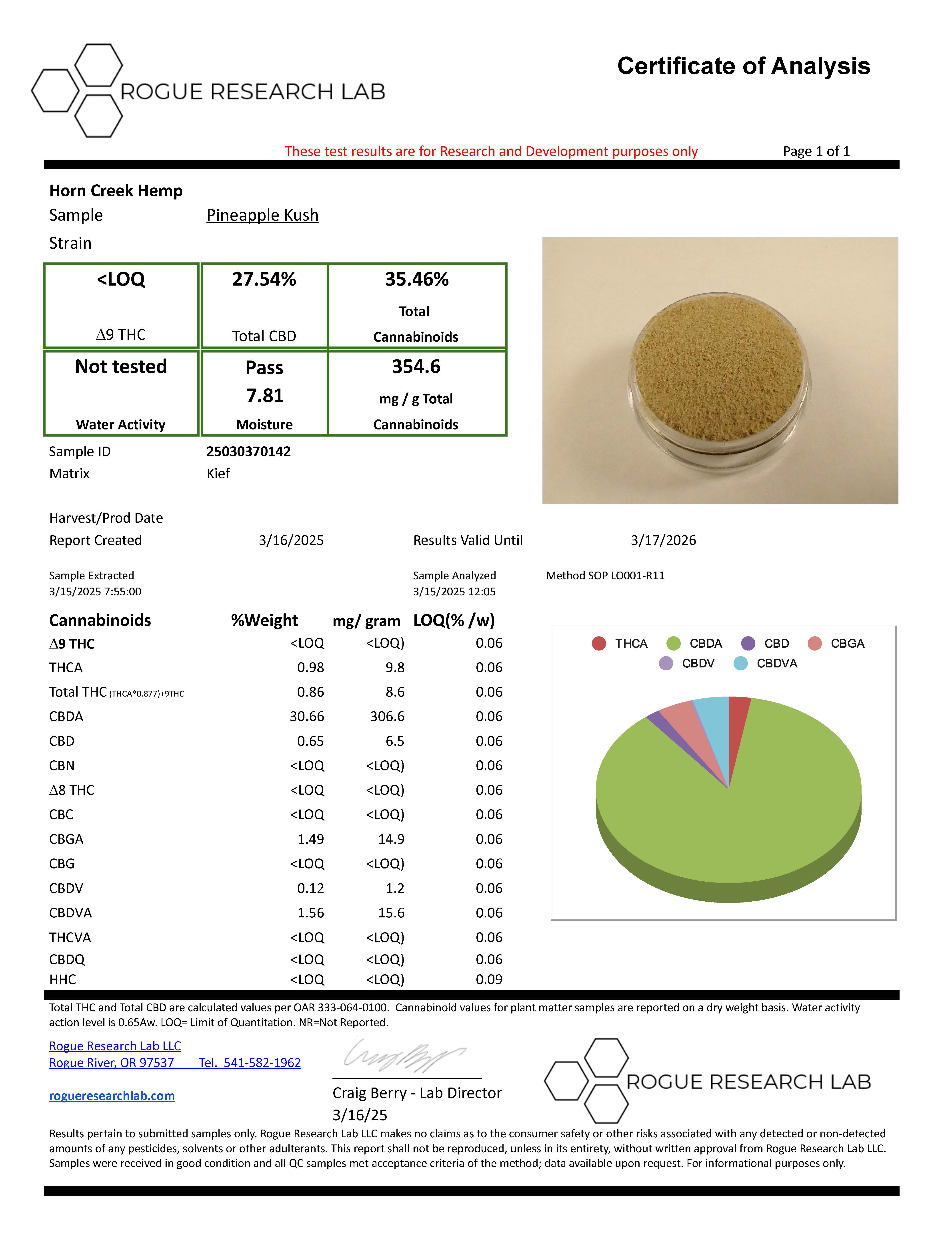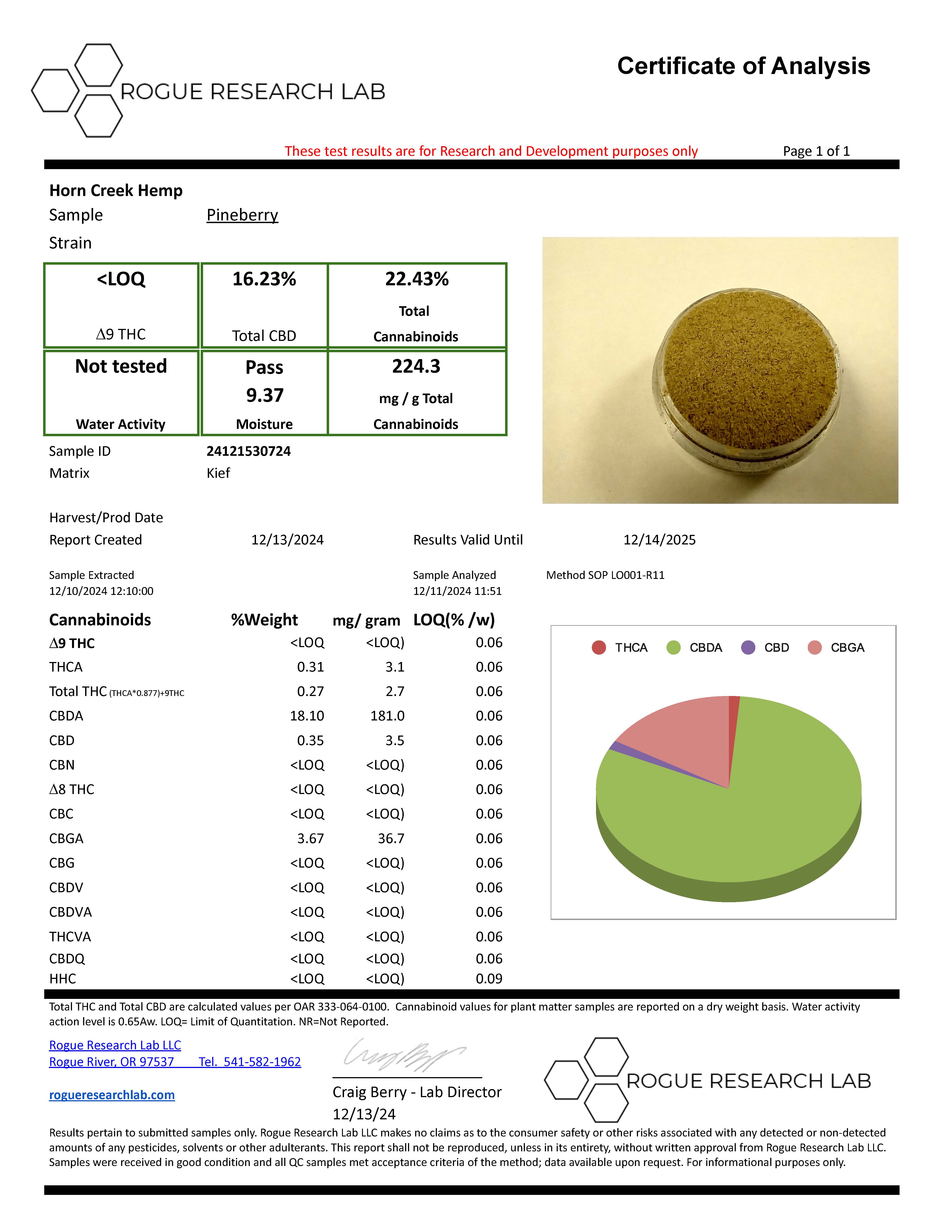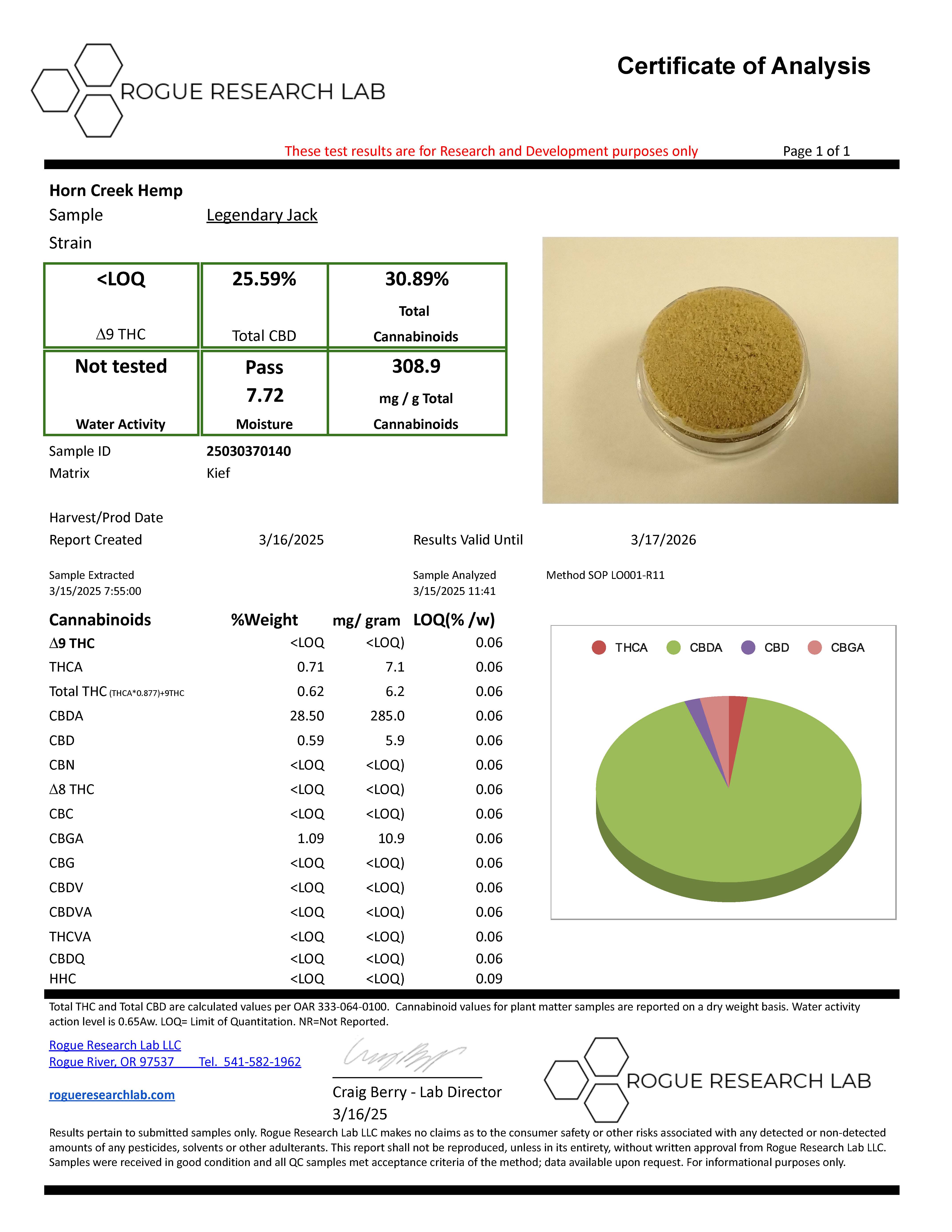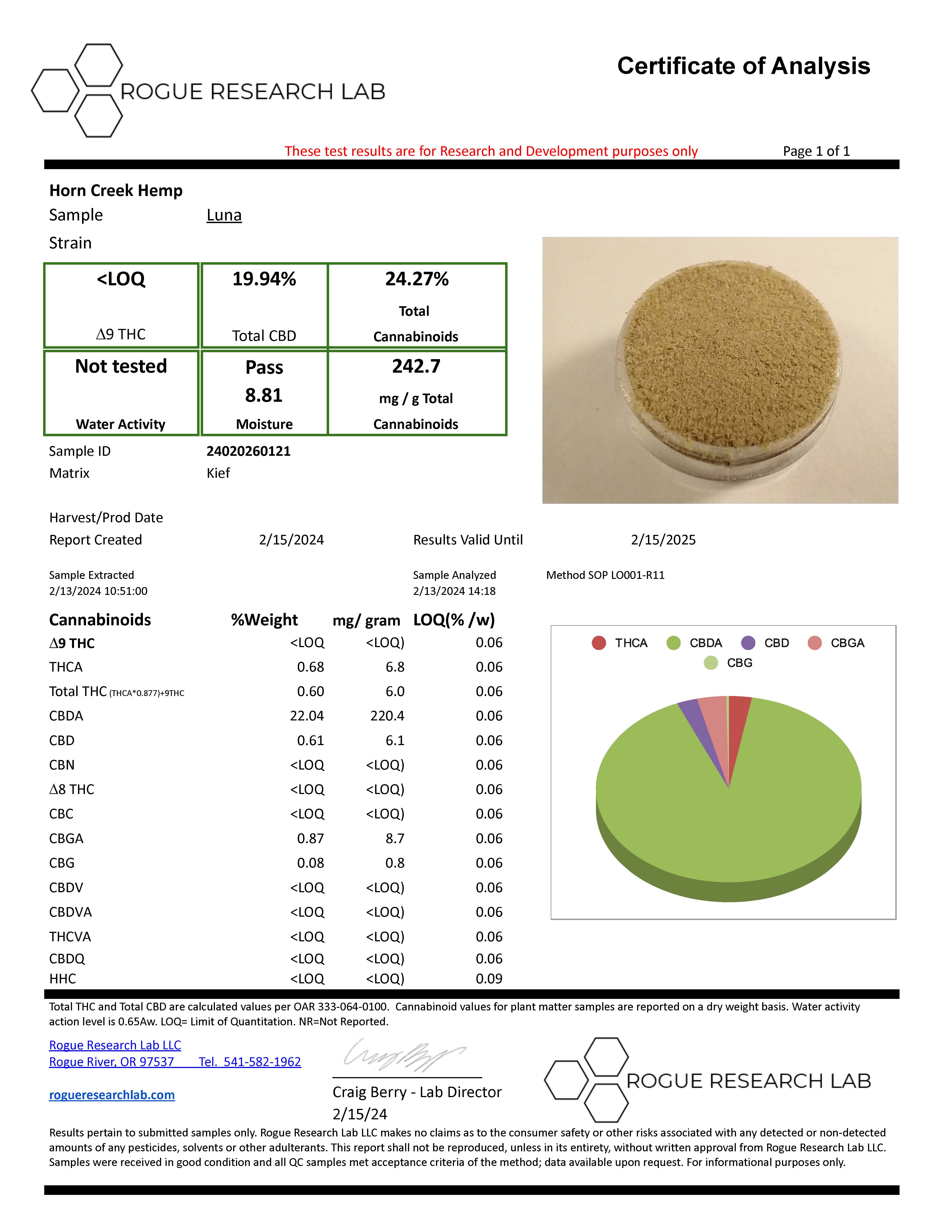 Kief is highly valued for its concentrated potency and versatility. Horn Creek’s Hemp Flower Kief is 100% natural and sourced from our own farm’s biodynamically grown hemp flowers, catering to both enthusiasts and connoisseurs. Our Special Sauce Kief, a gold medal winner in the 2020 Oregon Grower’s Cup and an honoree in the 2021 High Times People’s Choice Hemp Cup, exemplifies quality and excellence. With genetics originating from Oregon CBD, East Fork Cultivars, Hoku Seeds, and Infinite Tree, our kief is a top-tier product of sungrown, solvent-less CBD pollen. Its golden-brown color and cleaner, lighter flavor profile make it an excellent choice for enhancing experiences or creating refined edibles.