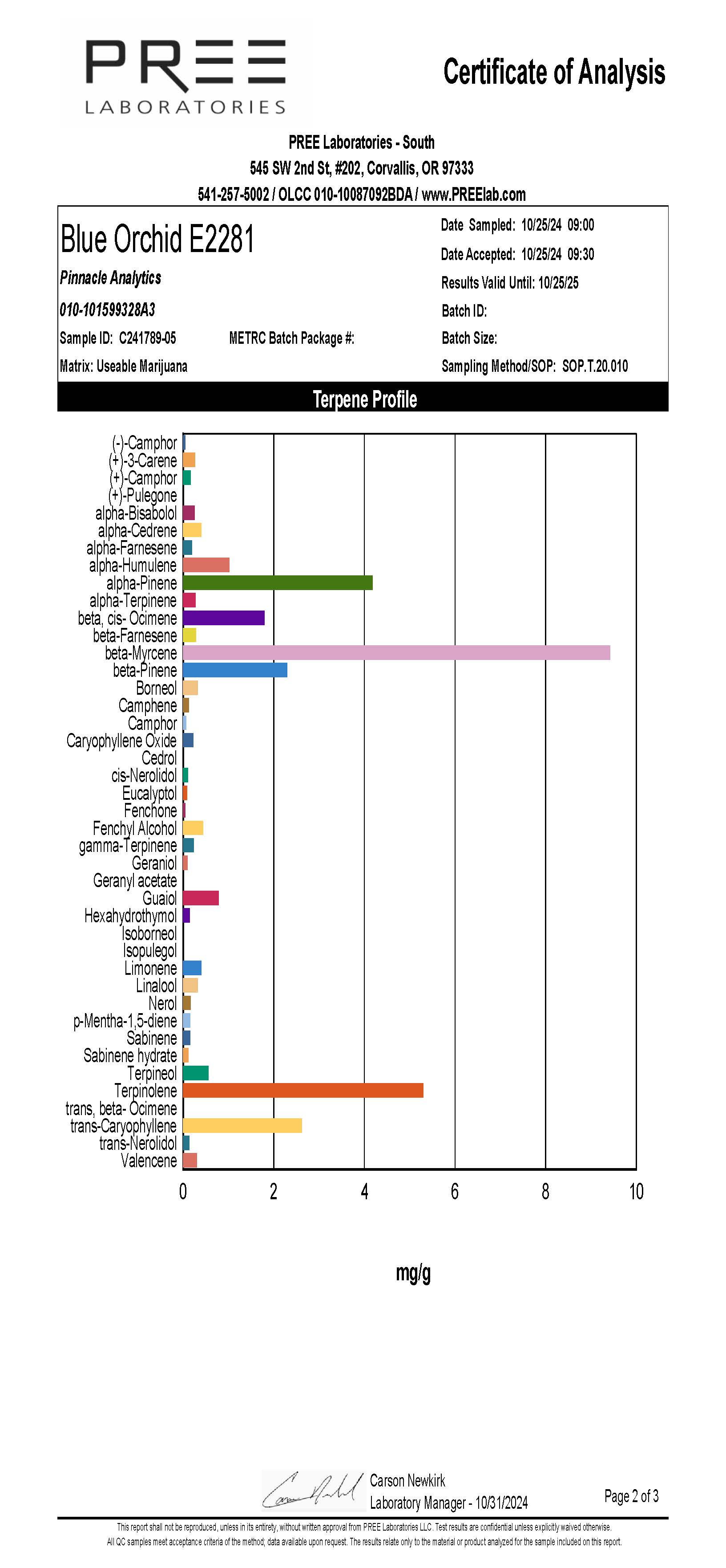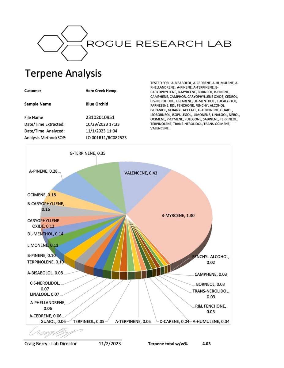 Terpene Profile: 3.33% | Top three in order of dominance: b-Myrcene, Terpinolene, a-Pinene