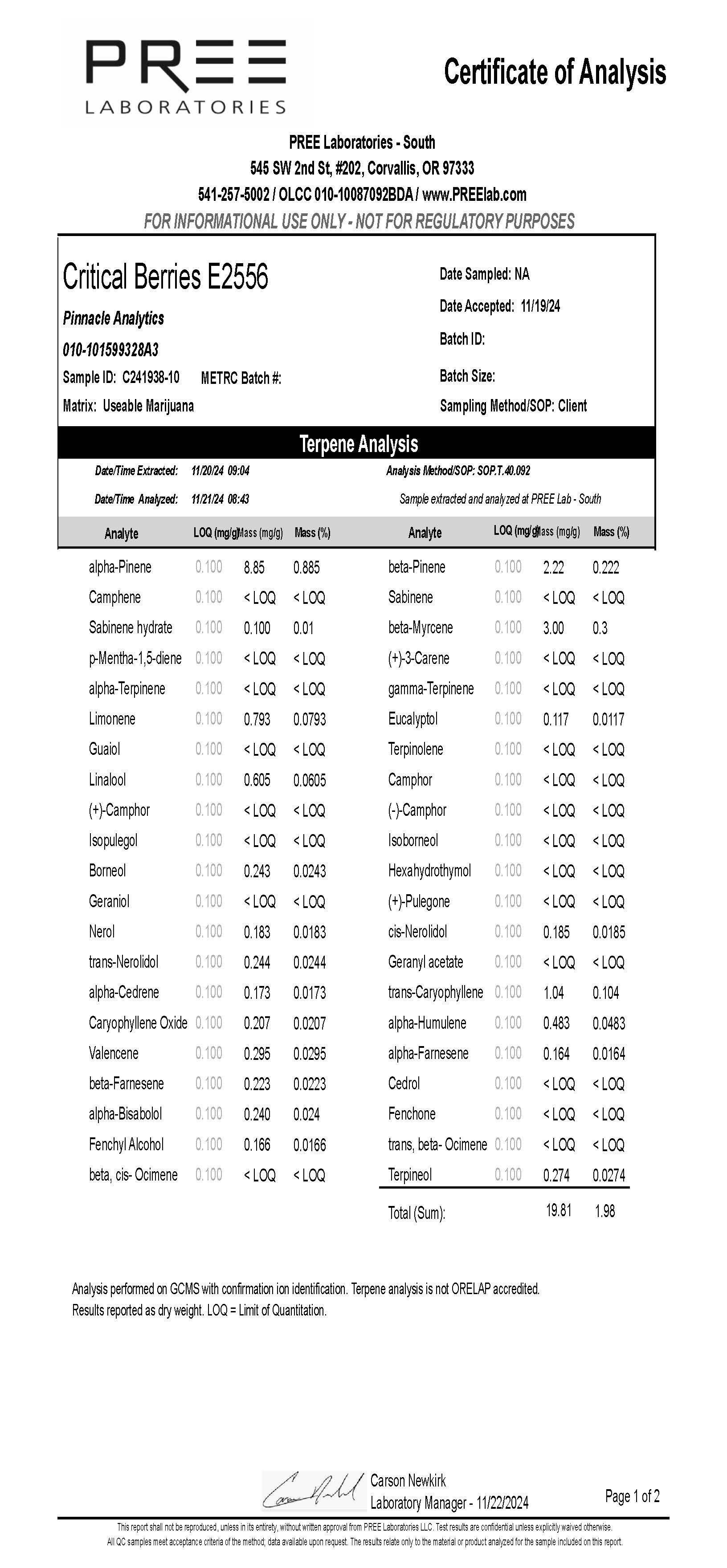 Terpene Profile: 2.33% | Top 4 in order of dominance: b-Myrcene, b-Caryophyllene, a-Pinene, terpinolene