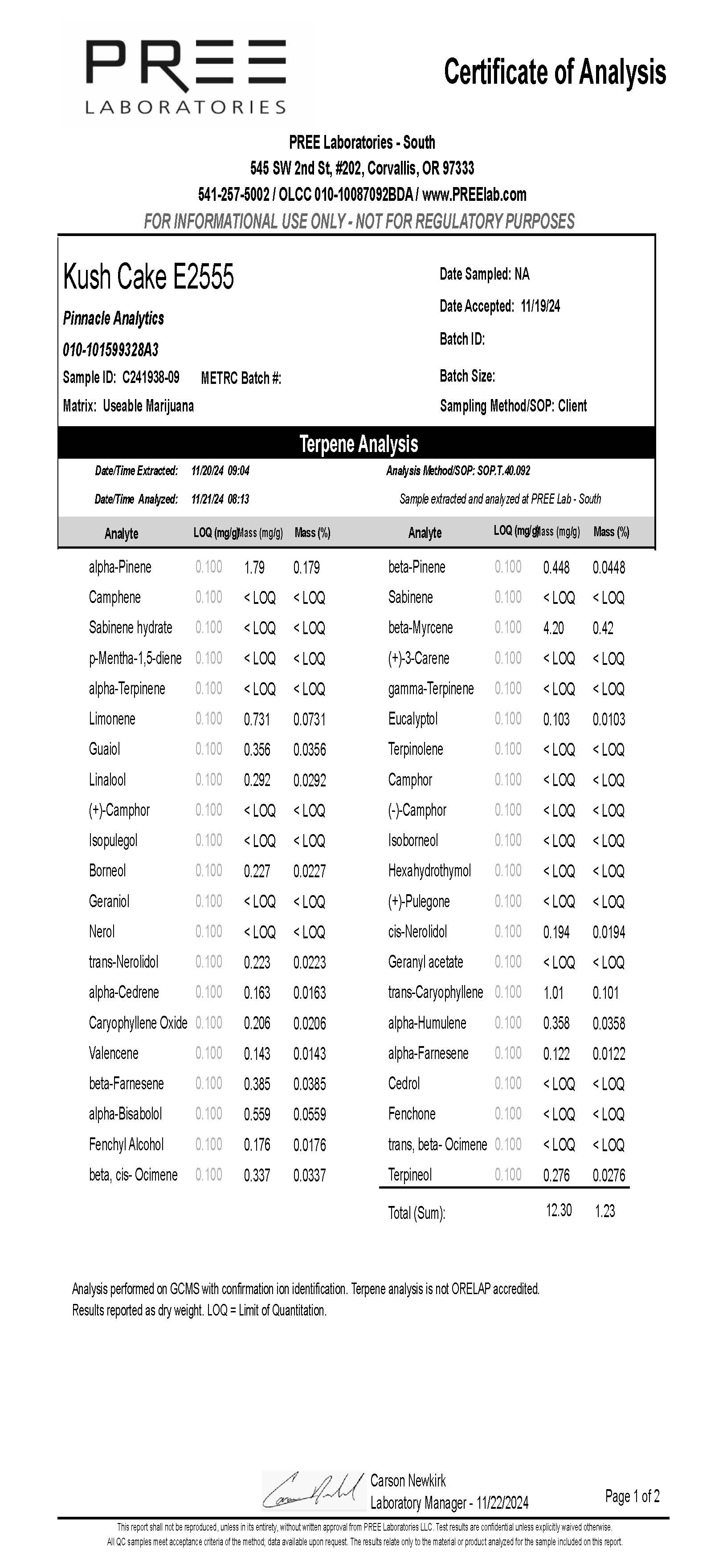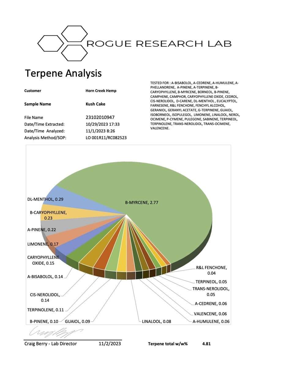 Terpene Profile: 1.23% | Top three in order of dominance: b-Myrcene, a-pinene, t-Caryophyllene