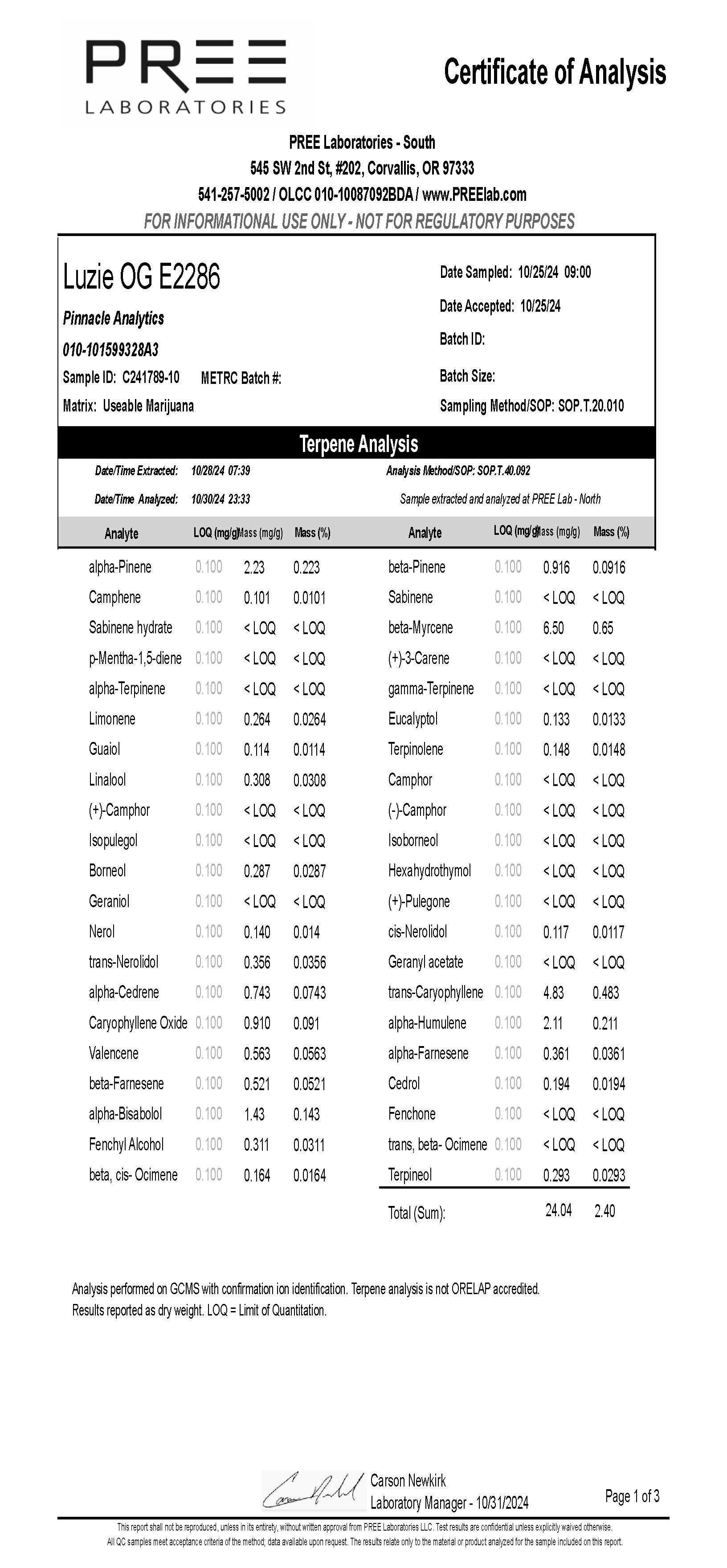 Terpene Profile: 2.4% | Top three in order of dominance: b-Myrcene, t-Caryophyllene, a-Pinene