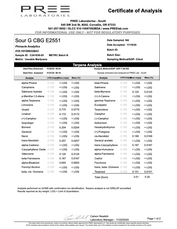 Cannabinoid Content: 12.33% | 12.1% CBG | < LOQ Delta 9